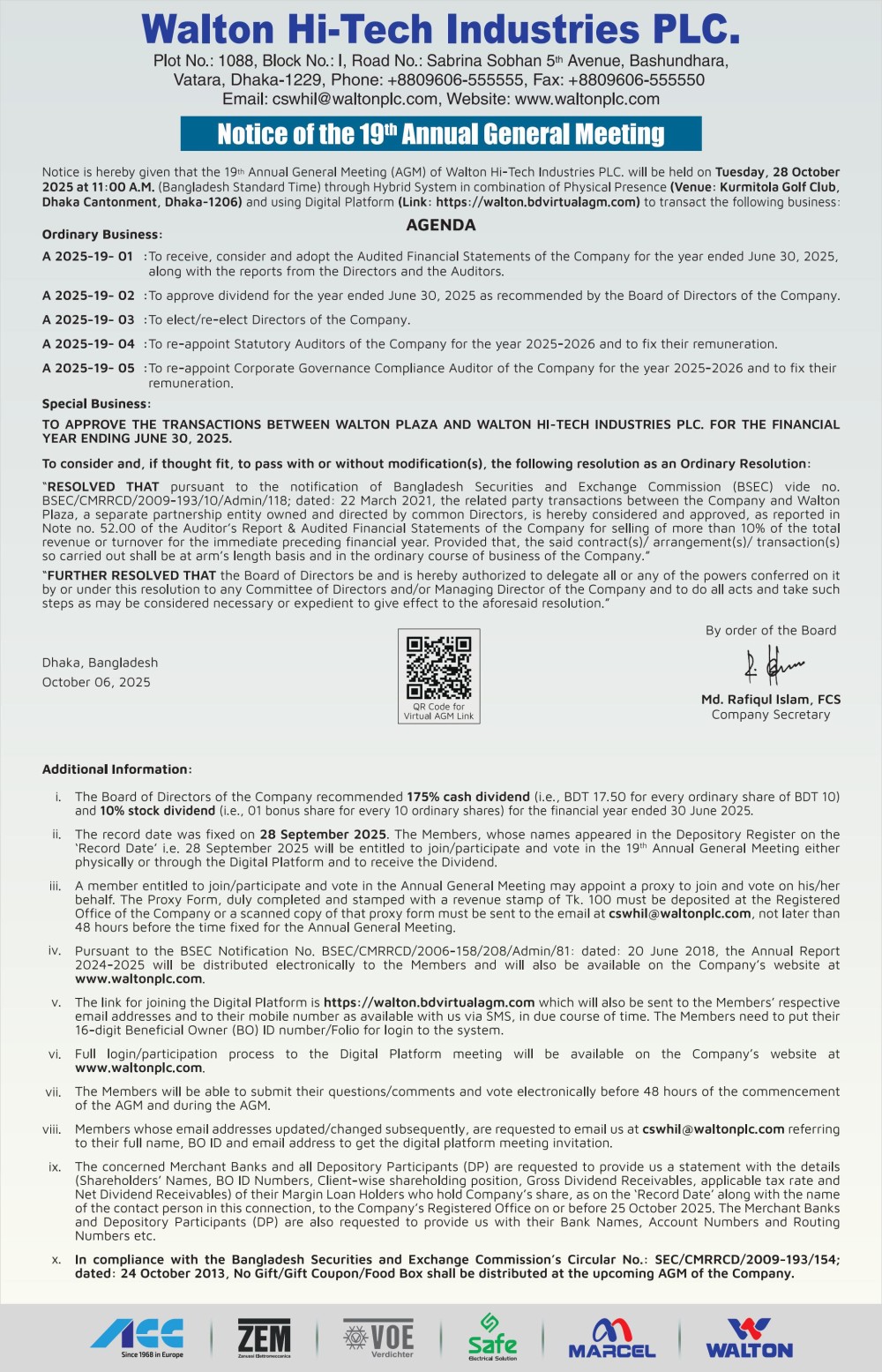 Notice of the 19th AGM of Walton Hi-Tech Industries PLC.