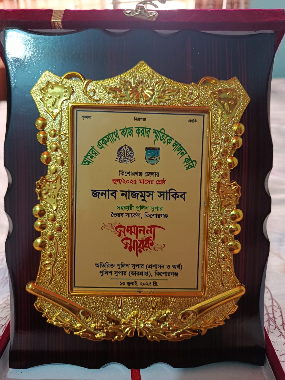 জানা যায়, সিনিয়র সহকারী পুলিশ সুপার নাজমুস সাকিব ভৈরব-কুলিয়ারচরে যোগদানের পর কিশোরগঞ্জ জেলা পুলিশ কার্যালয়ে মাসিক আইন-শৃঙ্খলা ও কল্যাণ সভায় জুন মাসের সার্বিক কাজের মূল্যায়ন স্বরূপ কিশোরগঞ্জ জেলার শ্রেষ্ঠ সার্কেল অফিসার হিসেবে মনোনীত হয়েছেন।