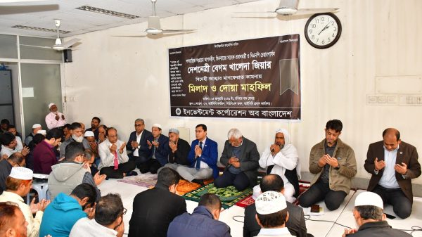 নিজস্ব প্রতিনিধি: ইনভেস্টমেন্ট কর্পোরেশন অব বাংলাদেশ (আইসিবি) এর উদ্যোগে সাবেক প্রধানমন্ত্রী ও বাংলাদেশ জাতীয়তাবাদী দল-বিএনপি’র চেয়ারপার্সন বেগম খালেদা জিয়ার মৃত্যুতে তাঁর বিদেহী আত্মার মাগফেরাত কামনা করে এক দোয়া ও মিলাদ