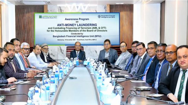 মার্কেন্টাইল ব্যাংকের অ্যান্টি মানি লন্ডারিং সচেতনতা প্রোগ্রাম গতকাল বুধবার (১৯ নভেম্বর ২০২৫) ব্যাংকের প্রধান কার্যালয়ের সভাকক্ষে অনুষ্ঠিত হয়। অনুষ্ঠানে প্রধান অতিথি হিসেবে উপস্থিত ছিলেন পরিচালক জনাব এ. কে. এম. গোলাম