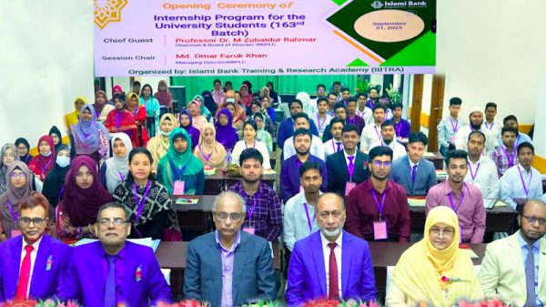 ইসলামী ব্যাংক ট্রেনিং অ্যান্ড রিসার্চ একাডেমি (আইবিটিআরএ) আয়োজিত ১৬৩ তম ইন্টার্নশিপ প্রোগ্রাম শুরু হয়েছে । সোমবার (১ সেপ্টেম্বর) ব্যাংকের চেয়ারম্যান প্রফেসর ড. এম জুবায়দুর রহমান প্রধান অতিথি হিসেবে এ প্রোগ্রামের