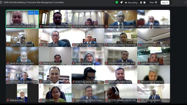 পূবালী ব্যাংক পিএলসির এক্সিকিউটিভ রিস্ক ম্যানেজমেন্ট কমিটির (ইআরএমসি) ২০০তম সভা সম্প্রতি ভার্চুয়াল প্ল্যাটফর্মের মাধ্যমে অনুষ্ঠিত হয়েছে। ব্যবস্থাপনা পরিচালক ও প্রধান নির্বাহী কর্মকর্তা মোহাম্মদ আলী প্রধান অতিথি হিসেবে এবং উপ-ব্যবস্থাপনা পরিচালক-