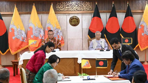 স্বাস্থ্য সহযোগিতা ও আন্তর্জাতিক ইন্টারনেট সংযোগ জোরদারে ভুটানের সঙ্গে দুটি সমঝোতা স্মারক সই করেছে বাংলাদেশ। শনিবার (২২ নভেম্বর) তেজগাঁওয়ে প্রধান উপদেষ্টার কার্যালয়ে দুই দেশের শীর্ষ নেতাদের দ্বিপাক্ষিক বৈঠকের পর এই