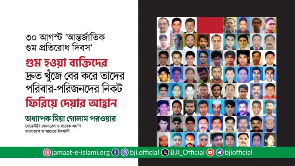 ৩০ আগস্ট ‘আন্তর্জাতিক গুম দিবস’ উপলক্ষে বাংলাদেশ জামায়াতে ইসলামীর সেক্রেটারি জেনারেল সাবেক এমপি অধ্যাপক মিয়া গোলাম পরওয়ার ২৯ আগস্ট এক বিবৃতি প্রদান করেছেন। বিবৃতিতে তিনি বলেন, “২০১১ সাল থেকে প্রতি