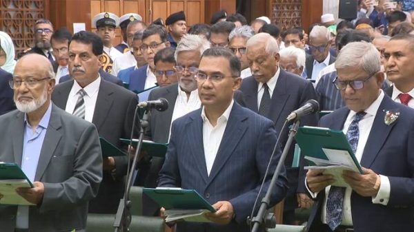 জাতীয় সংসদ ভবনের দক্ষিণ প্লাজায় প্রধানমন্ত্রী হিসেবে শপথ নিয়েছেন বিএনপির চেয়ারম্যান তারেক রহমান। মঙ্গলবার কিছুক্ষণ আগে রাষ্ট্রপতি মো. সাহাবুদ্দিন তাঁকে শপথ পড়ান। এদিকে জাতীয় সংসদের দক্ষিণ প্লাজায় মন্ত্রী পরিষদের শপথ