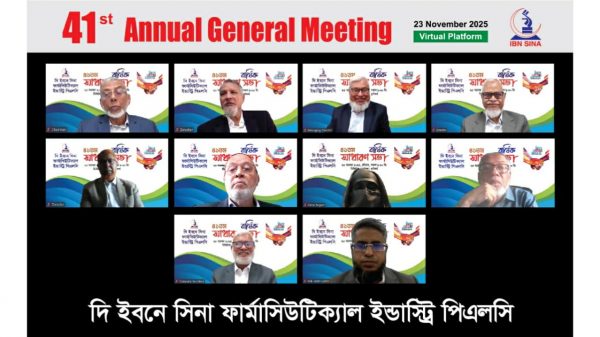 দি ইবনে সিনা ফার্মাসিউটিক্যাল ইন্ডাস্ট্রি পিএলসি -এর ৪১তম বার্ষিক সাধারণ সভা অনুষ্ঠিত হয়েছে। আজ রোববার (২৩ নভেম্বর) ডিজিটাল (ভার্চুয়াল) প্ল্যাটফর্মে এ সভা অনুষ্ঠিত হয়। সভায় সভাপতিত্ব করেন ইবনে সিনা ফার্মাসিউটিক্যালসের