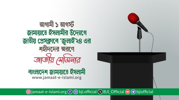 আগামী ১ আগস্ট জামায়াতে ইসলামীর উদ্যোগে জাতীয় প্রেসক্লাবে ‘জুলাই’২৪ এর শহীদদের স্মরণে জাতীয় সেমিনার জুলাই’২৪ এর গণঅভ্যুত্থান: প্রত্যাশা, প্রাপ্তি ও করণীয়’ শীর্ষক আলোচনা এবং ‘২য় স্বাধীনতার শহীদ যারা’ বইয়ের একাদশ