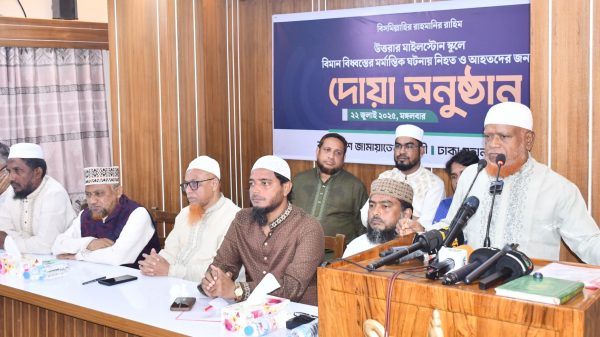 বাংলাদেশ জামায়াতে ইসলামী ঢাকা মহানগরী দক্ষিণের উদ্যোগে আজ ২২ জুলাই ২০২৫ মঙ্গলবার মাইলস্টোন স্কুলে মর্মান্তিক বিমান বিধ্বস্তের ঘটনায় নিহত ও আহতদের জন্য দো’য়া অনুষ্ঠানের আয়োজন করা হয়। পুরানা পল্টনস্থ ঢাকা