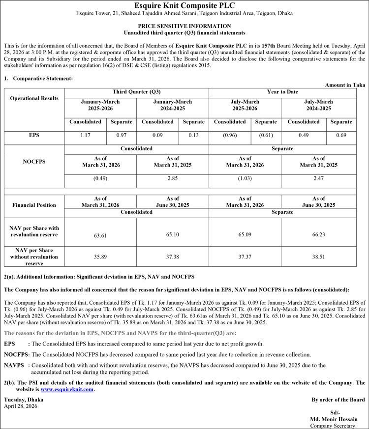 Price Sensitive Information of Esquire Knit Composite PLC.