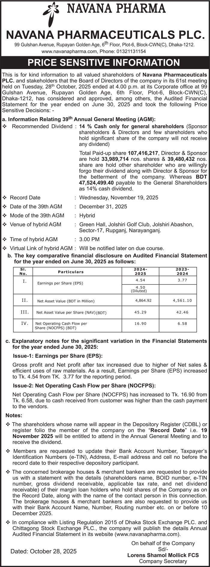 Price Sensitive Information of Navana Pharmaceuticals PLC.
