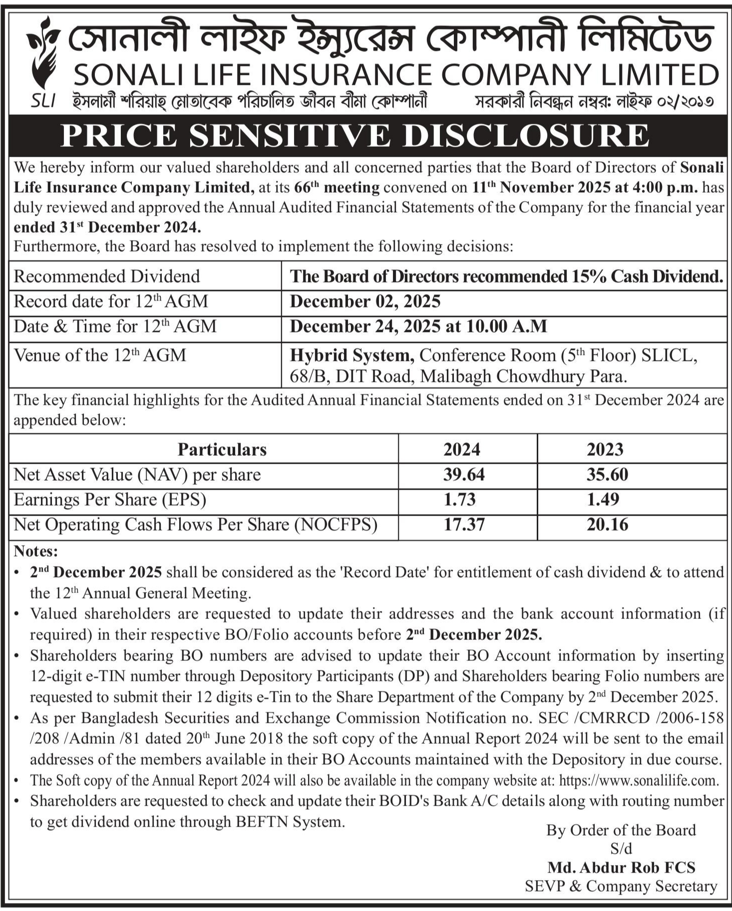 Price Sensitive Information of Sonali Life Insurance Company Limited