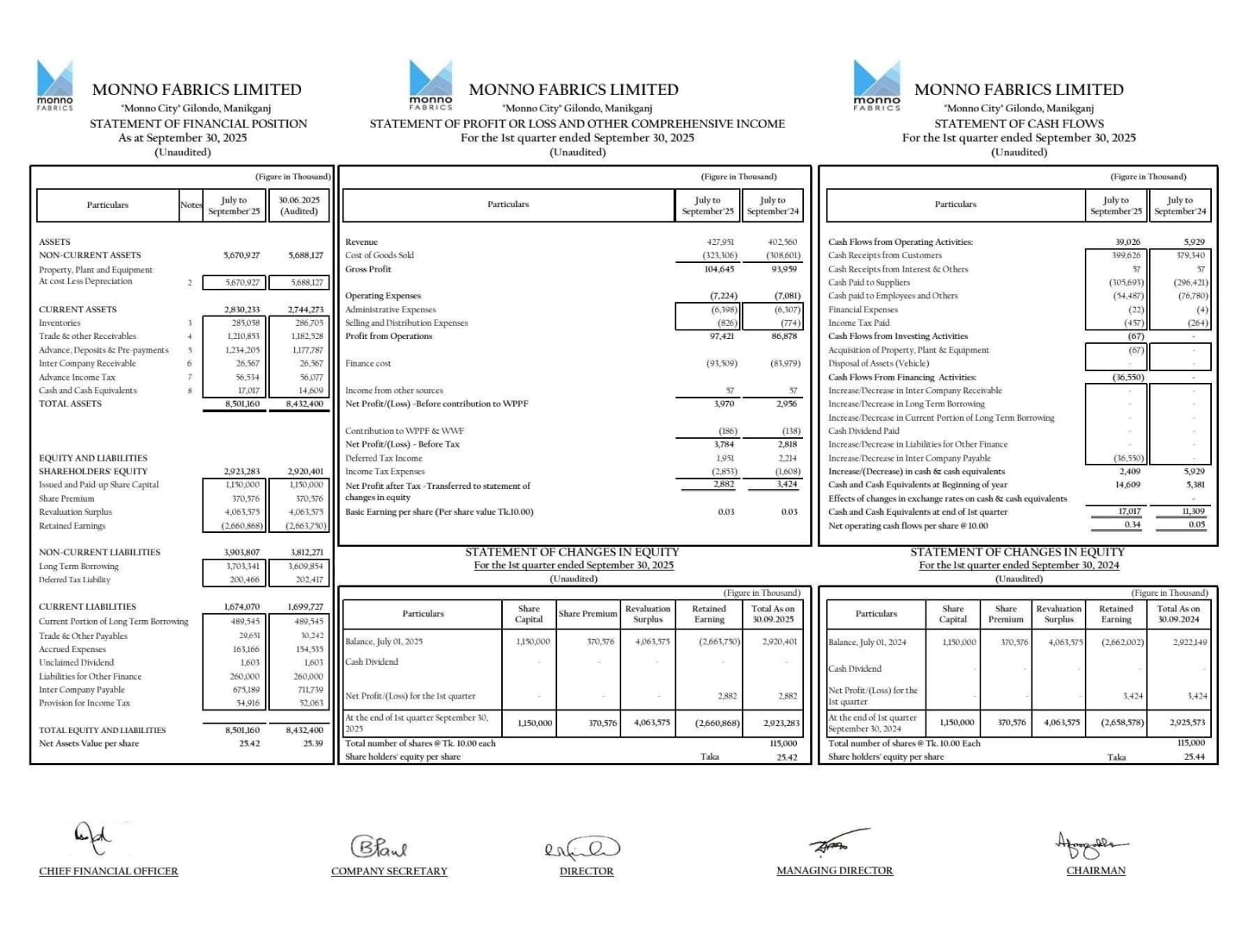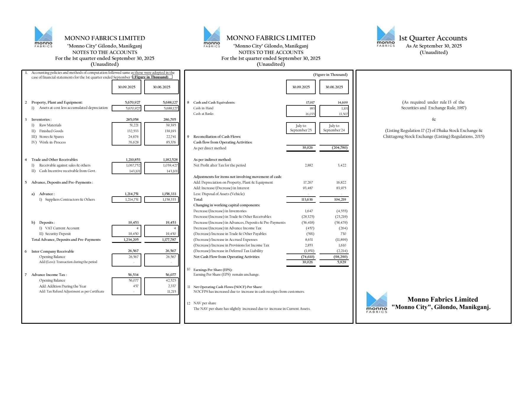 Un-audited Financial Statement (Q1) for the period ended on 30.09.2025 of Monno Fabrics limited.